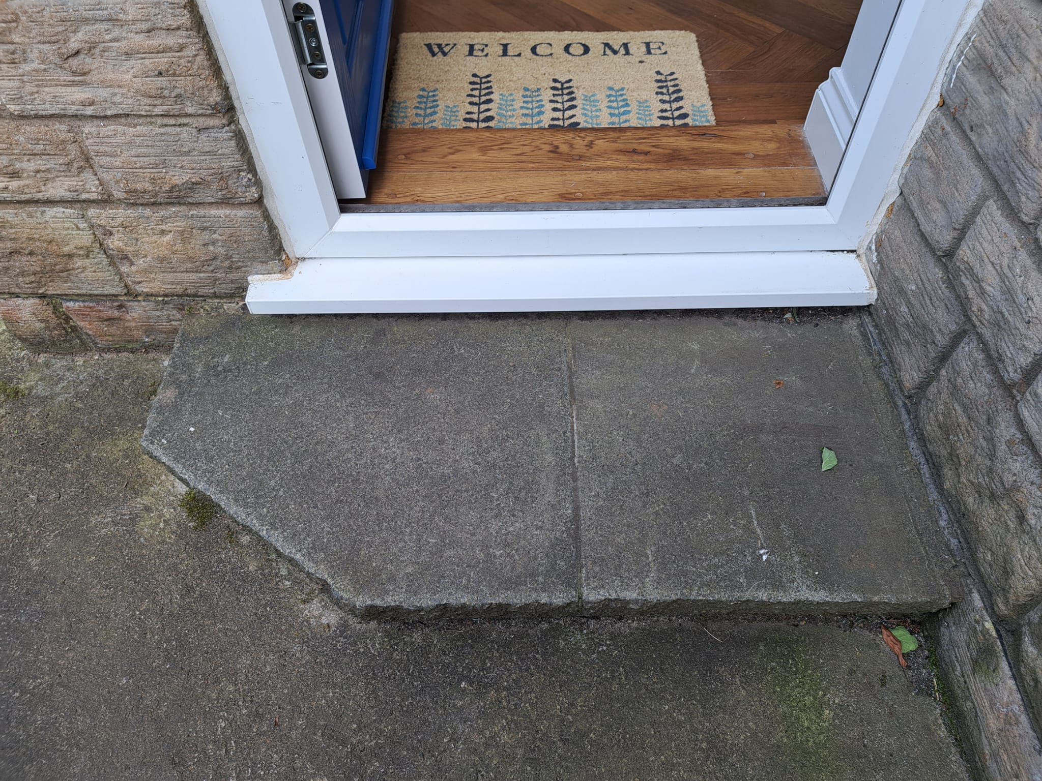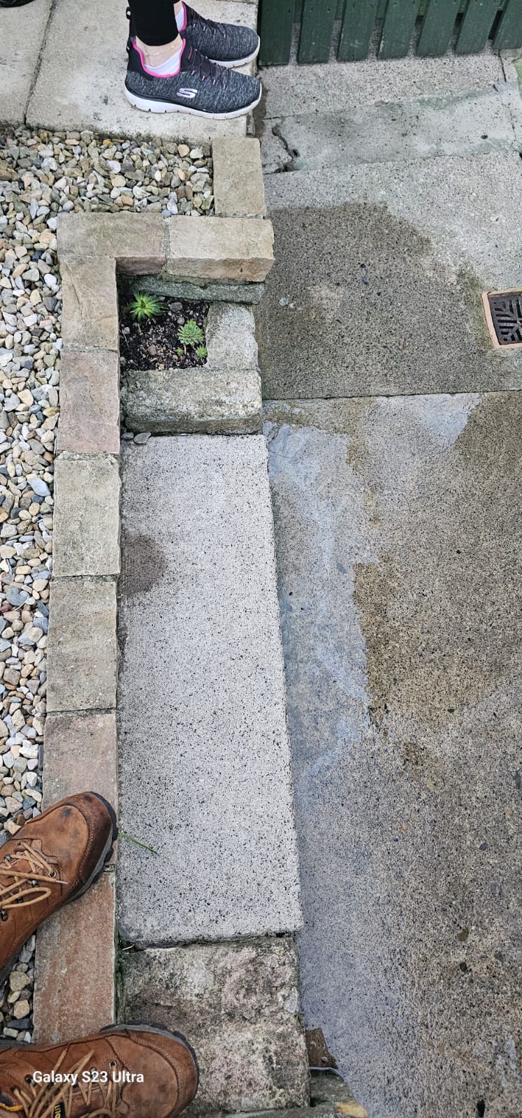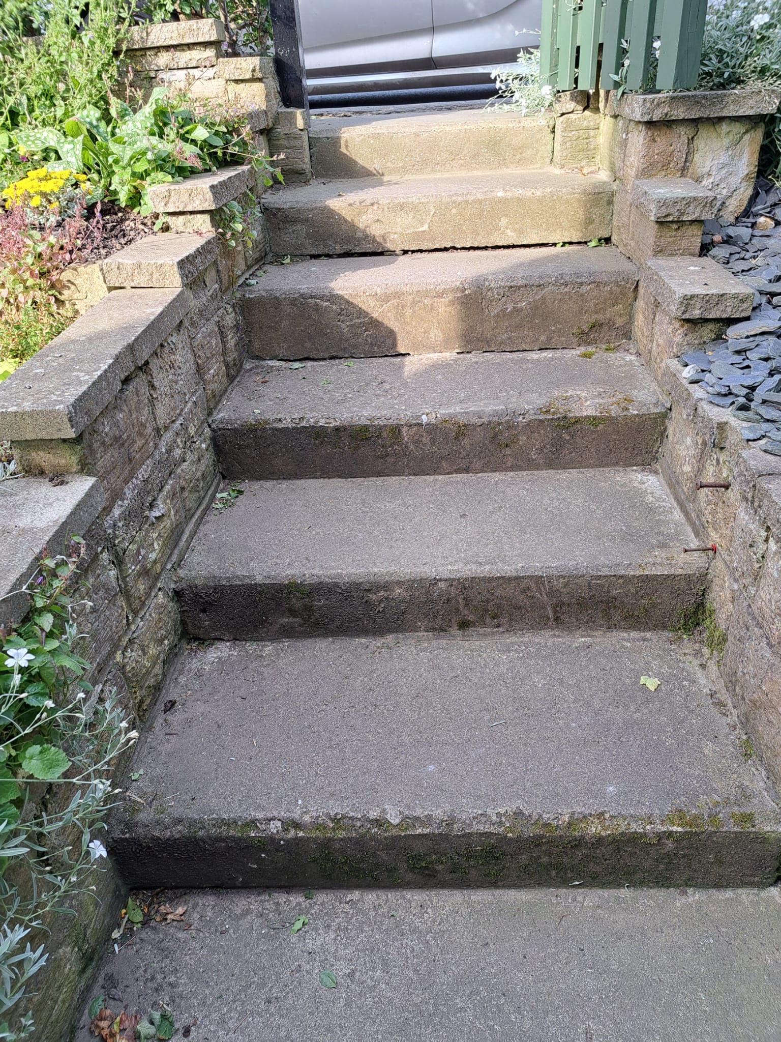 Front garden There is a flat concrete path that goes from the bottom of the front garden steps round the side of the house. There are also ......steps up to the top level of the front garden (however, there are no chairs or grass here and we only use these steps to get up and do the gardening)