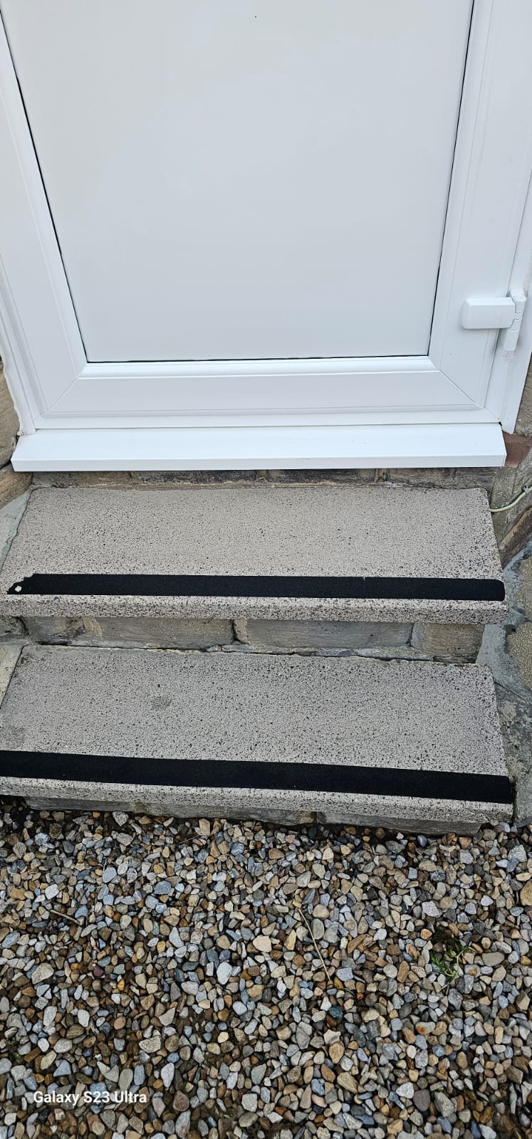 The back door access is reached from the parking/driveway. You go through the back garden gate and then up 2 small steps onto a gravel area. To reach the back door, there are a further 2 steps. There is a solar light which lights up the way.