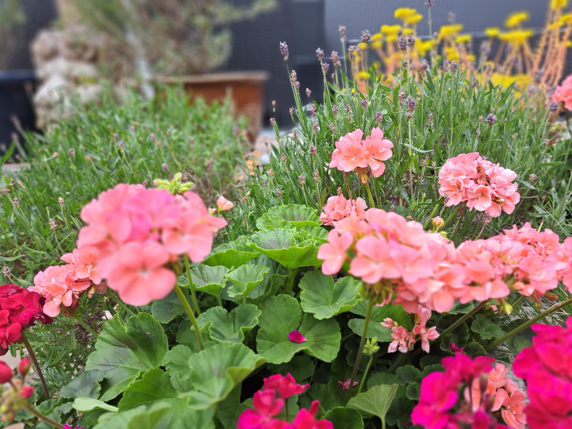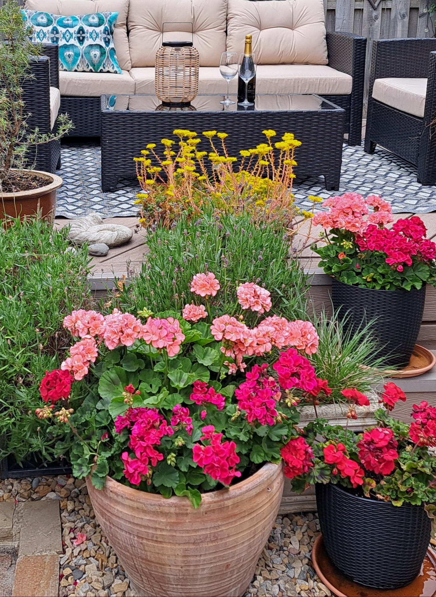 There are pots of pink and red geraniums, purple lavenders, rosemary and swaying grasses. When the scents of lavender and rosemary mingle in a gentle breeze, it creates a truly evocative experience.