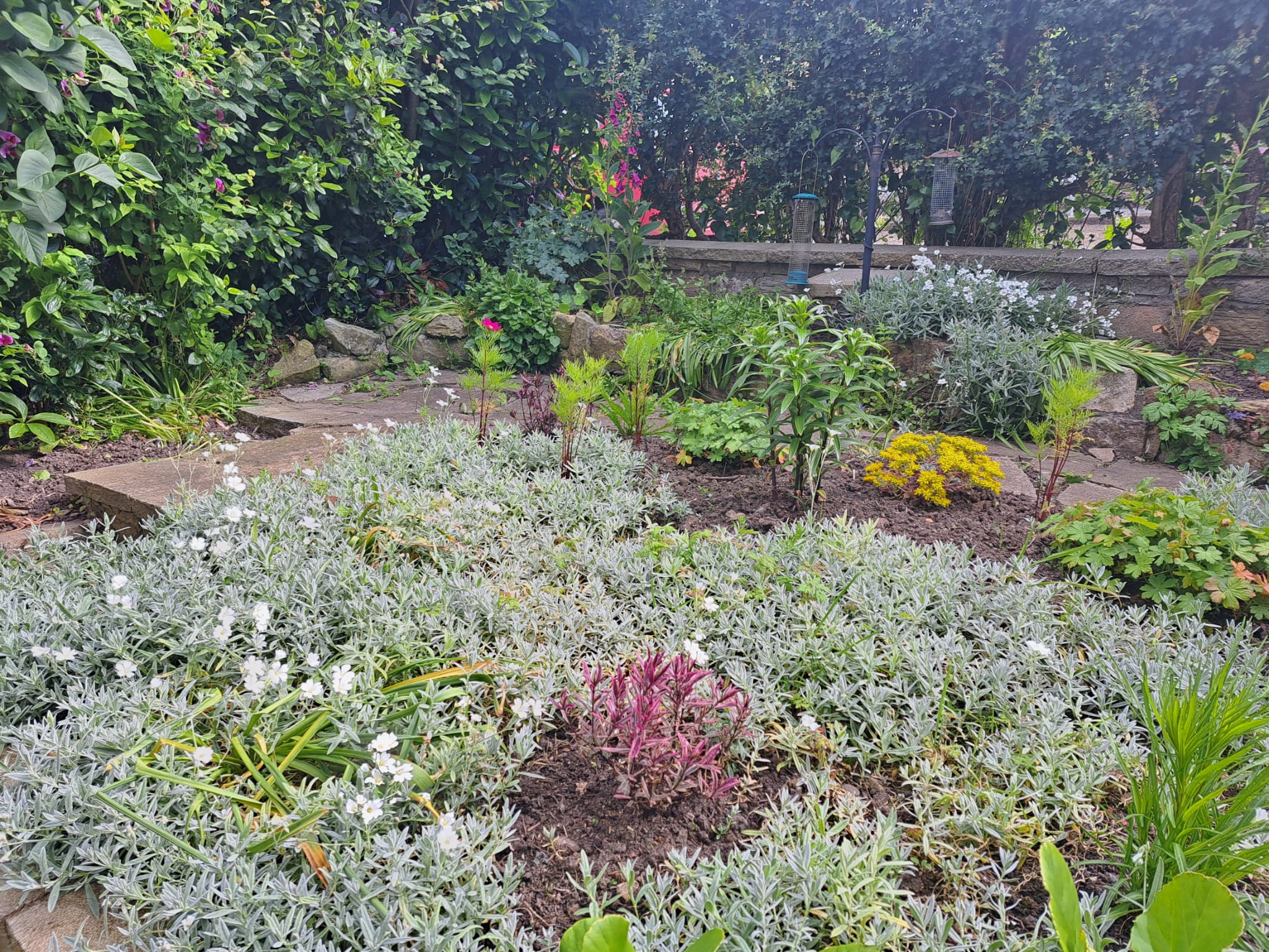 There is a small front garden with a variety of plants. We especially like the vivid everlasting pea with purple pink flowers.